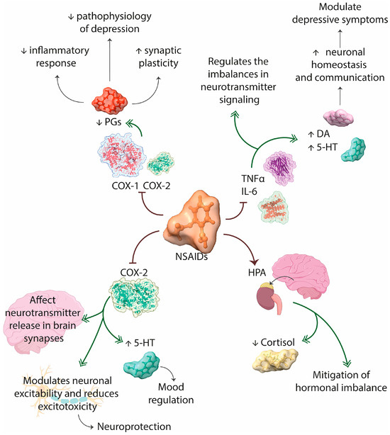 Moreover, chronic inflammation can have a significant impact on the hypothalamic-pituitary-adrenal (HPA) axis, a system involved in the physiological stress response. The HPA axis regulates the release of hormones, such as cortisol, which is found at elevated levels in individuals with MDD [120]. Thus, NSAIDs, by reducing the inflammatory burden, could contribute to normalizing the activity and sensitivity of the axis, mitigating the hormonal imbalances associated with depression (Figure 4).