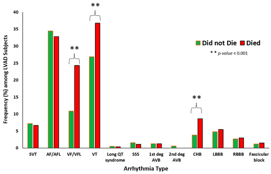 Comparative distribution of arrhythmias between subjects with LVAD who died versus those who survived the hospitalization. SVT: supraventricular tachycardia; AF/AFL: atrial fibrillation/flutter; VF/VFL: ventricular fibrillation/flutter; SSS: sick sinus syndrome; AVB: atrioventricular block; CHB: complete heart block; LBBB: left bundle branch block; RBBB: right bundle branch block.