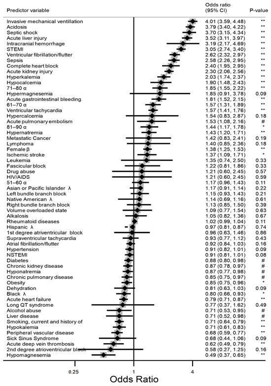 Forest plot of the unadjusted odds of mortality among hospitalizations with LVAD. Key: α = reference age group:18–50 years; β = compared to males; λ = compared to whites. # = p-value < 0.05, * = p-value < 0.01; ** = p-value < 0.001.
