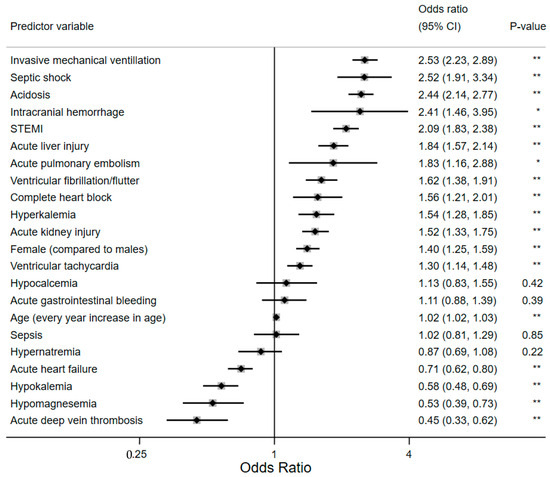 Forest plot showing the predictors of in-patient mortality among subjects with LVAD in multivariable logistic regression analysis. Key: * = p-value < 0.01; ** = p-value < 0.001.