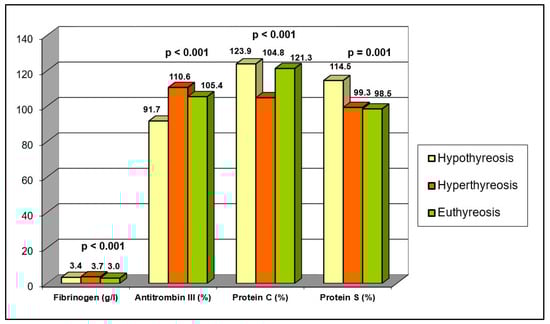 The mean value of antithrombin III was significantly higher in the group of hyperthyroid patients in comparison to the euthyroid control and group of hypothyroid patients (p = 0.001)—Table 2 and Figure 1. Furthermore, patients with hypothyroidism had antithrombin III values below the lower limit of normal (<75%) significantly more frequently than patients with hyperthyroidism and participants from the euthyroid control group.
