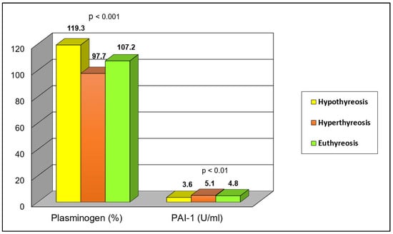 The values of plasminogen and PAI-1 in relation to thyroid status are presented in Table 2 and Figure 2. Although a higher percentage of patients with hyperthyroidism had plasminogen values below the reference limit (<75%) compared to euthyroid patients and patients with hypothyroidism, this difference was not statistically significant. However, by comparing the mean values of plasminogen, a significantly lower value was found in the group of patients with hyperthyroidism compared to the value in the group of hypothyroid patients and the value in the group of euthyroid participants (p = 0.000).