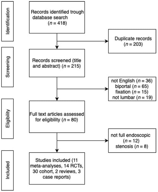 Our comprehensive literature search across multiple databases identified a total of 418 records. From these, we removed 203 duplicates, narrowing our pool to 215 records. These records were then screened based on title and abstract, which led to the exclusion of 36 records that were not in English, 65 records that included biportal studies, 15 records related to endoscopic fixation, and 19 records that were not specific to lumbar procedures (Figure 1).