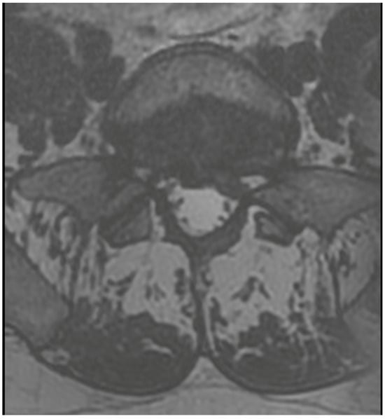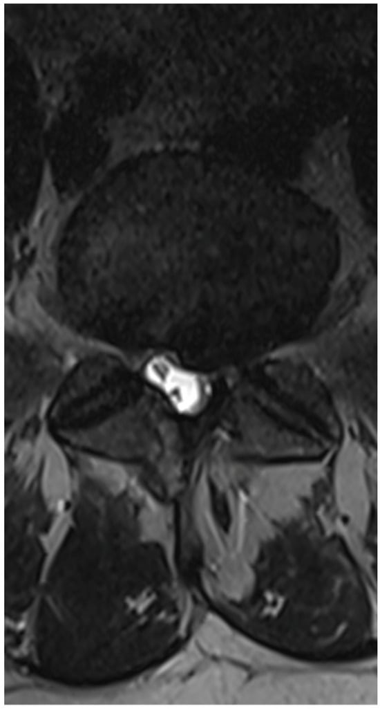 A 36-year-old male was scheduled for surgery due to a left-sided L5/S1 disc extrusion (Figure 2). The patient had undergone surgery at this level on the opposite side 10 years earlier. A left-sided interlaminar approach was chosen. During the procedure, difficulties were encountered in mobilizing neural structures while rotating the working channel. However, after several attempts at mobilization, the extrusion was visualized and removed in several small fragments. Upon awakening, the patient reported numbness in the perianal region and difficulty urinating. Examination revealed a slight decrease in rectal sphincter tone and subtle weakness in the dorsal flexion of both feet. A follow-up MRI showed shrinkage of the dural sac at the operated level (Figure 3). A decision was made for open revision surgery, performed several hours after the initial procedure. During the revision, damage to the dural sac on the right side was found, along with a small subdural hematoma located among the nerve fibers, which was not visible during the endoscopic procedure. The hematoma was removed, the sac was sutured, and it was sealed with Tachosil. Postoperatively, the patient experienced slight improvement but required further urorehabilitation. Subsequent MRIs showed gradual absorption of postoperative changes and the sealing of the dural sac. With stimulation and rehabilitation, there was gradual improvement, a return of sexual function, and sphincter efficiency. Three months later, the patient experienced a gradual recurrence of disorders, especially sexual function. An MRI revealed a small recurrent herniation. Due to the absence of pain syndrome, the patient was initially treated conservatively, but decided on revision surgery at another center a week later. Post-surgery, there was an improvement in function, but slight deterioration occurred a few days later. An MRI showed a small iatrogenic joint cyst on the left side, causing slight stenosis. The postoperative course included a superficial MSSE infection treated with antibiotics. Further MRIs showed the resolution of the changes with the absorption of the cyst (Figure 4). Ultimately, the patient healed, functioning normally with proper sexual functions, though occasionally experiencing discomfort in the perianal area.