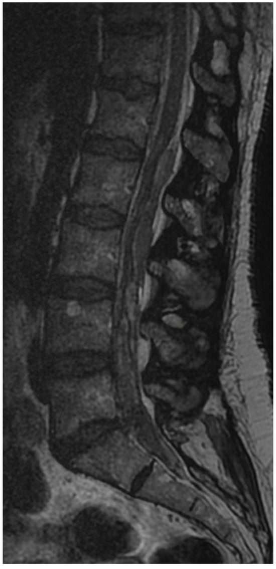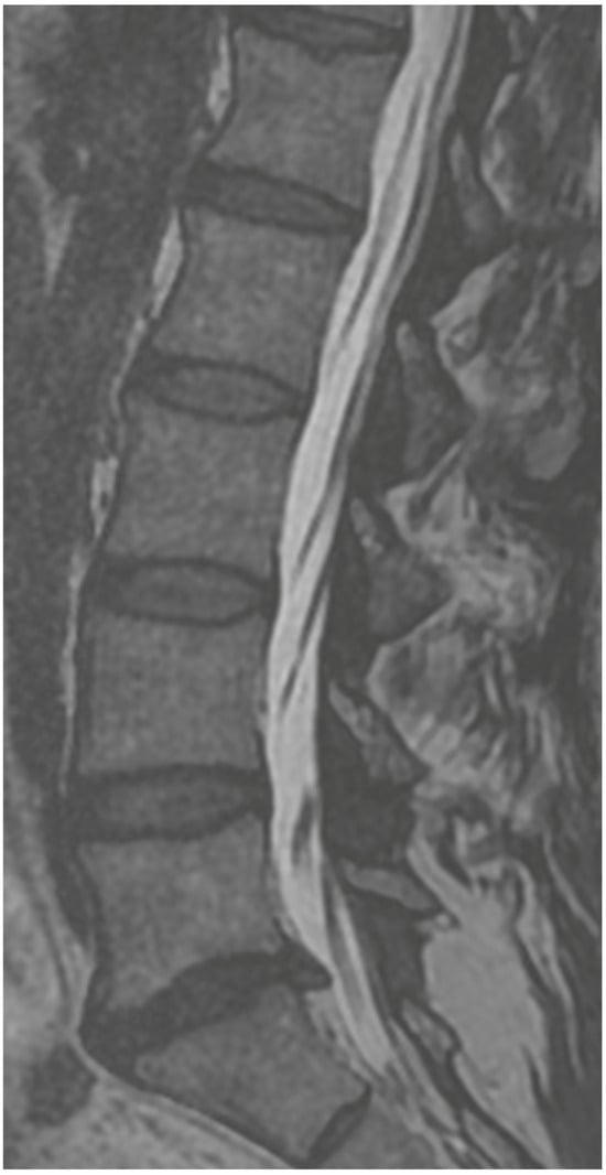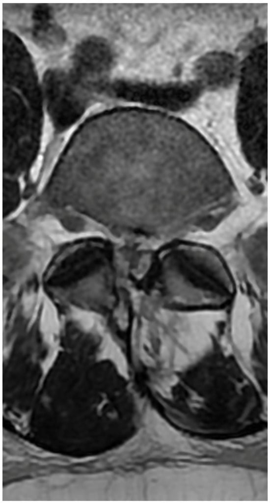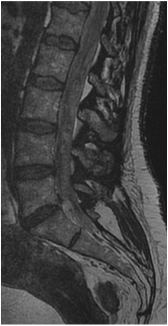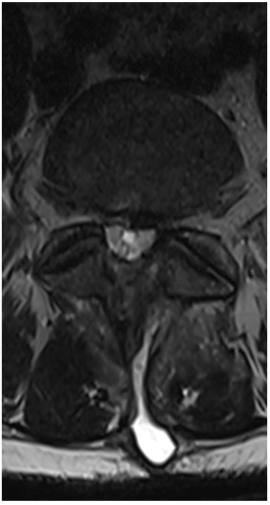 A 50-year-old female patient was scheduled for endoscopic surgery to treat L5/S1 discopathy (Figure 5 and Figure 6). A posterior access was made, and the endoscope was navigated through the yellow ligament via an interlaminar window, which was sufficiently wide and required no additional drilling. Neural structures were mobilized, and the herniation was removed. Post-awakening, the patient was pain-free and mobilized with physiotherapist assistance on the same day. Upon standing, she experienced acute lumbar pain, preventing movement. A control MRI revealed an acute hematoma within the dural sac (Figure 7). Due to persistent discomfort 24 h post-surgery, an unsuccessful lumbar puncture attempt was made, followed by a decision for conservative treatment. On day 4, the patient developed complete lower limb paralysis, loss of sensation, and sphincter paralysis. A follow-up MRI showed hematoma progression to the conus medullaris level (Figure 8). Despite the dramatic progression, surgical revision was not undertaken. The following day, sensation and movement gradually returned to the limbs, and the patient was rehabilitated. By day 11, she was mobilized and discharged with functioning sphincters but persistent acute LS pain syndrome. Over the next two months, she reported LS pain, severe headaches, and episodes of unconsciousness. Subsequent MRIs showed gradual hematoma resolution (Figure 9). Approximately two months post-surgery, the patient regained full function, and acute pain subsided.