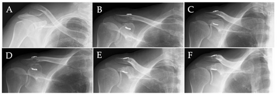 From January 2021 to February 2022, six consecutive patients with modified Neer type IIB lateral clavicle fractures and CC ligament injury underwent mini-open reduction and arthroscopically assisted CC stabilization using the AC Dog Bone Button device (Arthrex, Naples, FL, USA) by a senior surgeon (D.M.). All patients were classified via preoperative X-ray and computed tomography (CT) examinations and followed up for a minimum of 12 months.