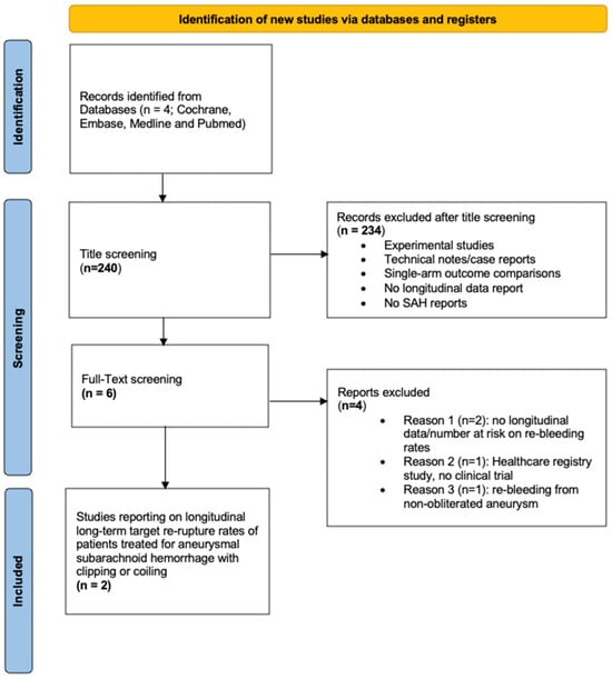- Zhu, W.; Ling, X.; Petersen, J.D.; Liu, J.; Xiao, A.; Huang, J. Clipping versus coiling for aneurysmal subarachnoid hemorrhage: A systematic review and meta-analysis of prospective studies. Neurosurg. Rev. 2022, 45, 1291–1302. [Google Scholar] [CrossRef] [PubMed]