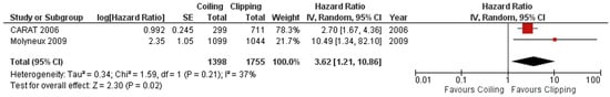 To assess the robustness of the results, a two-phase meta-analysis was carried out. Concerning rerupture-free survival, the pooled hazard ratio was 3.62 (95% CI: 1.21–10.86, p = 0.02) confirming the outcomes observed in the initial one-stage meta-analysis and affirming an association between coiling and risk of late rerupture of the initial target aneurysm after primary aSAH treatment. Conversely, clipping was associated with a reduced risk (HR (inverse hazard ratio and 95% CI): 0.28 (95% CI: 0.09–0.83, p = 0.02)) of rerupture of the initial target aneurysm causing recurrent aSAH. Figure 3 shows a forest plot displaying the results of the analysis. The investigation of rerupture-free survival demonstrated minimal heterogeneity across the studies (I2 = 37%, p = 0.21).