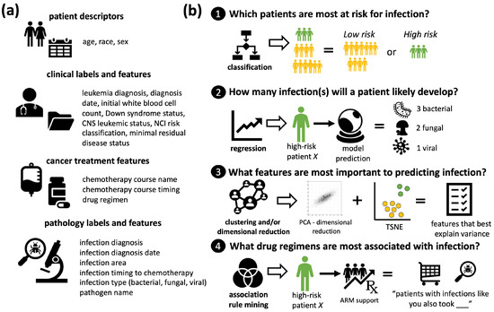 Association rule mining (ARM) looks for common associations or features that co-occur and can be used to assess the risk of infection development in children being treated for AML or ALL. In particular, ARM was utilized to study the co-occurrence of specific chemotherapy drugs and infection. Relationships of significance between feature value pairs were identified using FP-Growth [56,57].