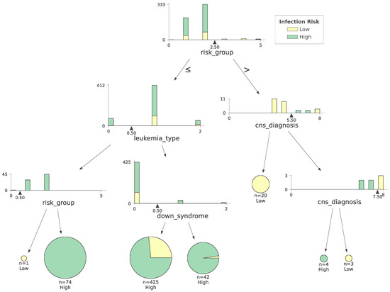A decision tree provides an excellent way to visualize the stratification of patients by infection risk. Each node represents a split in the data. The splits continue until all patients have been classified as either high risk or low risk. A decision tree performing infection risk stratification is shown in Figure 3. For the sake of tractable visualization, the tree shown has been pruned to four levels. The green illustrates the patients with a high risk of infection and the yellow illustrates the patients with a low risk of infection. Beyond the leukemia type, the most predictive attributes shown are the presence/absence of leukemia cells in the central nervous system at the time of initial diagnosis and the presence/absence of Down syndrome at the time of initial diagnosis).
