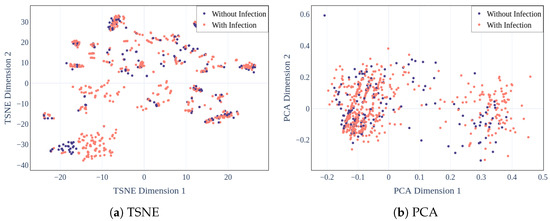 One way to better interpret the infection prediction model’s results was to assess the separability of the high infection risk and low infection risk classes using unsupervised learning. In particular, dimensionality reduction techniques can visualize the feature space used to build the infection risk stratification model. Principal component analysis (PCA) [35] and t-distributed stochastic neighbor embedding (TSNE) [36] were used to reduce the feature space to two dimensions. The patients with a high infection risk (e.g., had at least one treated infection) are highlighted in red, and those with a low infection risk (e.g., had no treated infection) are shown in blue. The points are visualized in a 2D plot based on the values of the two dimensions in Figure 4.