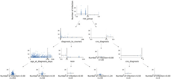 Decision tree for infection risk stratification in pediatric ALL and pediatric AML. Due to space constraints, the tree is pruned to show only the first four decision splits.
