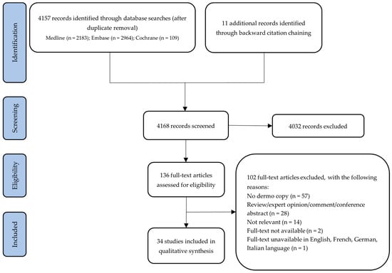 The risk-of-bias assessment of included studies is presented in Supplementary Table S2. In all papers except one [], the risk of bias was assessed as low (33/34; 61.8%). The paper by Gracia-Darder [] was published as a photo submission (“Visual Dermatology”), and despite the lack of detailed patient data, the article was included in the qualitative synthesis as it meticulously described dermoscopic features of the underlying condition.