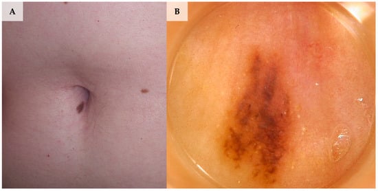 Compound nevus (with a predominant junctional component) of the umbilicus in a patient with atypical mole syndrome. (A) Clinical presentation. (B) Dermoscopy shows small, hyperpigmented patches and angulated lines over a brown, structureless background (FotoFinder, Medicam 800 HD, FotoFinder Systems GmbH, Bad Birnbach, Germany; ×20 magnification, immersion gel).