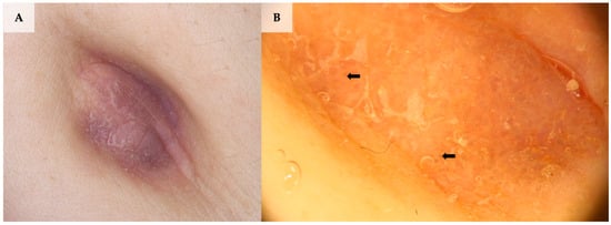 More evidence was extracted from reports concerning cutaneous endometriosis and SMJN. Despite some differences in the dermoscopic presentation of both conditions (polymorphic vessels in SMJN and a combination of bluish and brown structureless areas in endometriosis), the final diagnosis cannot be established based on dermoscopy. In such cases, periodical alternations in clinical and dermoscopic presentation may be supportive [].