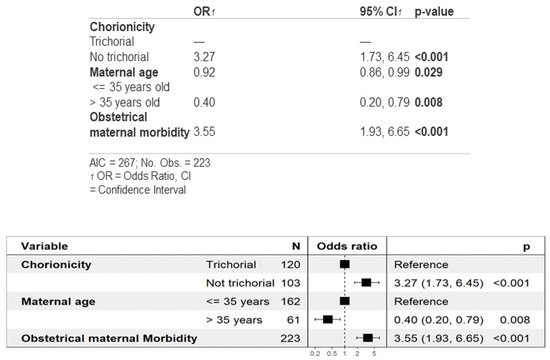 As it has been established in previous literature, prematurity, low birth weight and neonatal mortality were the most relevant complications in non-trichorionic triplet pregnancies when compared to trichorionic. Therefore, we decided to conduct several multivariate logistic regressions to deepen our understanding of these variables. The relationship between each of the complications (neonatal mortality, prematurity <34 weeks, prematurity <28 weeks, restricted intrauterine growth, small for gestational age, birth weight and neonatal morbidity) and a set of multiple explanatory variables was evaluated by multivariate logistic regression. The selection of the set of explanatory variables for each complication was carried out by minimizing the Akaike information criterion and following clinical criteria. The effect size is reported as the odds ratio together with its confidence interval.