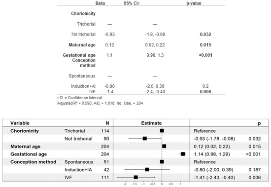 Neonatal complications are described in Table 2C. Specifically, the average birth weight was 1612 g, which was significantly higher in the trichorional group than the non-trichorional group. To analyze this finding in detail, we performed a multivariate analysis for the estimation of the mean birth weight, shown in Figure 2. Non-trichorionicity and IVF were found to be risk factors for lower birth weight, while maternal age and gestational age were associated with higher birth weight. As shown in Table 2C,D, in which neonatal complications and perinatal mortality are described, although 99% of the neonates survived the neonatal period, a total of 11 (4.8%) cases of neonatal death occurred, all of them in trichorionic pregnancies. Of those who survived the neonatal period, 26% required major neonatal resuscitation ≥III), and two of them obtained a cord pH under 7.10, both of which were from non-trichorionic pregnancies. A total of 9.6% of the newborns of non-trichorionic pregnancies obtained a 5 min APGAR score < 7, in contrast to 3.3% of the newborns from trichorionic pregnancies. A total of 34% of the newborns were admitted to the NICU, although the differences according to chorionicity were not significant. Regarding the main neonatal complication, 61% of the newborns presented respiratory distress syndrome, which was more frequent among the newborns of non-trichorionic pregnancies (71% vs. 53%). However, there were no significant differences in relation to chorionicity for the other neonatal complications.