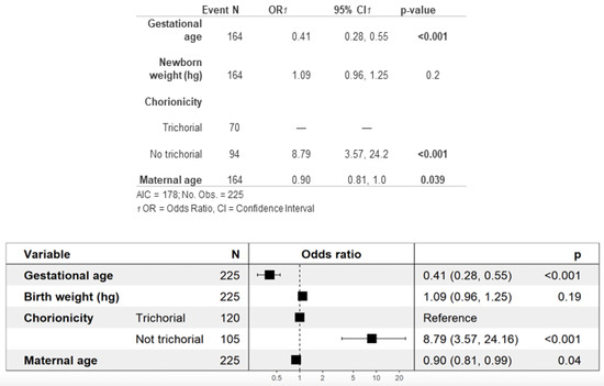 Overall, a higher neonatal morbidity was found among newborns of non-trichorionic pregnancies than among those of trichorionic pregnancies (90% vs. 57%). As shown in Figure 3, the multivariate analysis for neonatal morbidity showed that newborns of non-trichorionic pregnancies have an 8.79 times higher risk of developing some type of morbidity than newborns of trichorionic pregnancies. Furthermore, the lower the gestational and maternal ages are, the higher the risk of neonatal comorbidity will be.