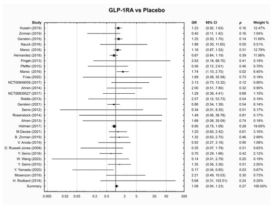 Pairwise meta-analysis, GLP-1RA vs. placebo [6,20,22,23,24,25,26,27,30,46,47,49,51,52,55,57,58,61,62,63,65,66,67,69,71,73,74].