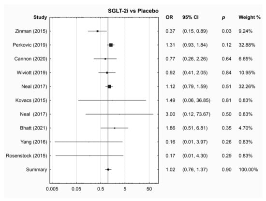 Pairwise meta-analysis, SGLT-2i vs. placebo [33,34,35,36,38,42,48,68,70].