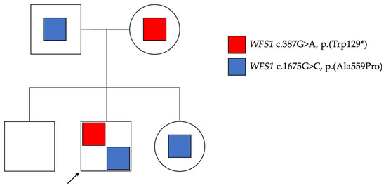 Family pedigree. The proband (arrow) showed a double heterozygous pathogenic variant in the WFS1 gene: a nonsense variant, c.387G>A, determining a stop codon, p.(Trp129*), and a missense variant, c.1675G>C, p.(Ala559Pro). The variant c.387G>A was inherited from the mother and absent in the proband’s siblings, while the variant c.1675G>C was inherited from the father and also present in the proband’s sister.