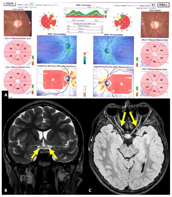 Optic atrophy. Optical coherence tomography (OCT) (A) showed a significant reduction in retinal nerve fiber layer (RNFL) thickness and extensive damage of ganglion cell layer (GCL). Brain magnetic resonance (MR), in the coronal T2 scan (B) and the axial fluid-attenuated inversion recovery (FLAIR) scan (C), showed marked thinning of the optic chiasm (arrows in (B)) and the optic nerves (arrows in (C)). Overall, OCT and brain MR were consistent with bilateral optic atrophy.