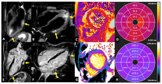 Cardiac involvement. Cardiac magnetic resonance, at the 3-chamber long axis (LA) (A) and 4-chamber LA (B). The STIR images show areas of hyperintensity, suggestive of focal edema, in the basal and apical inferolateral segments (arrows in (A,B)). T2 mapping (C) shows a segmental increase in T2 relaxation time (bull’s eye in (D); normal values < 50 ms), especially in the lateral and inferior walls from base to apex. The corresponding 3-chamber LA (E) and 4-chamber LA (F). The LGE images show the LGE with subepicardial distribution in the same areas of the edema (arrows in (E,F)). T1 mapping (G) shows a diffuse increase in T1 relaxation time (bull’s eye in (H); normal values < 1045 ms), which is more evident in the lateral wall.