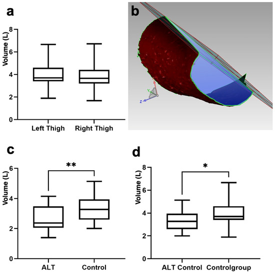 (a) Thigh volume of the control cohort; (b) image of three-dimensional computer-based volume determination; (c) thigh volume of the ALT cohort and control cohort; (d) thigh volume of the control leg of the ALT cohort (the non-operated leg) and thigh volume of control cohort. ** p < 0.01; * p < 0.05.