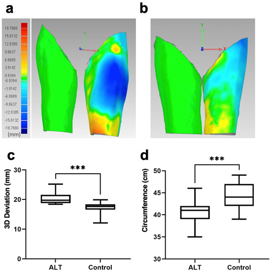 Thermal maps of the two superimposed matched scans of the thighs illustrate the areas where the mirrored thighs were joined without spacing by the software-based best-fit tool, and the other thigh shows the divergence of thigh shape between the two thighs and in the ALT group between the donor site and the unoperated leg of the opposite side (Figure 2a,b). In the control group, the maximum three-dimensional deviation between the right and left thighs was 17 ± 1.9 mm (Figure 2c). In contrast, in the ALT group, the mean maximum three-dimensional deviation of 20 ± 2.1 mm (p < 0.001) was significantly higher (Figure 2d).