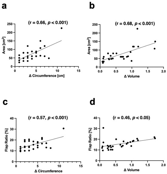 A significant positive correlation was found between flap area and Δthigh circumference (r = 0.66, p < 0.001) as well as between flap area and Δvolume (r = 0.68, p < 0.001). A significant positive correlation was also found between flap ratio and thigh circumference, with Δthigh circumference (r = 0.57, p < 0.001) and Δvolume (r = 0.46, p < 0.05) (Figure 3).