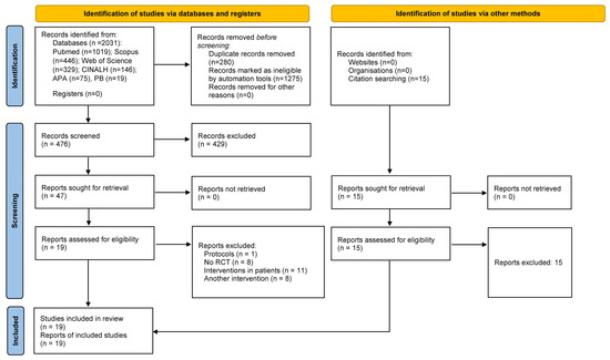 Figure 1 shows the PRISMA flowchart describing the selection process for this systematic review. Two thousand and thirty-one preliminary articles were found in the databases. After removing duplicates and records marked as ineligible by automated tools, 476 articles were scanned for title and abstract, and 429 were excluded. A total of 47 articles were read in full, and 28 articles were excluded. Nineteen articles [43,44,45,46,47,48,49,50,51,52,53,54,55,56,57,58,59,60,61] met the eligibility criteria and were included in the final review. No further articles were found by searching other sources.