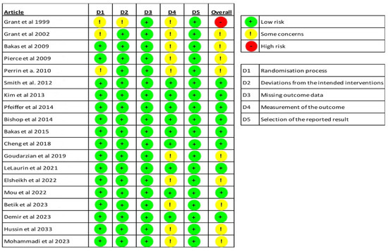Nine articles have a low risk of bias [48,49,50,51,52,53,55,57,59], nine have some concerns [44,45,46,47,54,56,58,60,61] and one study has a high risk of bias [43]. Figure 2 shows the results of the RoB2 scale.