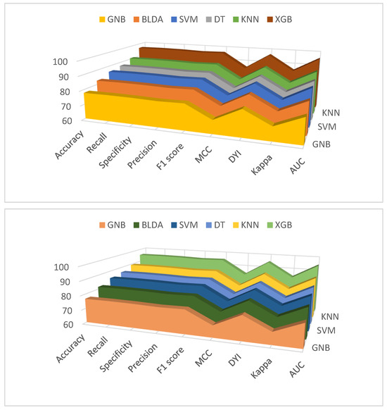In this study, we tested several ML algorithms to evaluate the performance of our proposed method. We chose the top-performing five algorithms from those widely recognized in the scientific community. These include decision trees (DT) [25], Gaussian naive Bayes (GNB) [26], Bayesian linear discriminant analysis (BLDA) [27], K-nearest neighbors (KNN) [28], and support vector machines (SVM) [29]. We built the models using the MatLab Statistical and Machine Learning Toolbox (MatLab 2022a; The MathWorks, Natick, MA, USA). The dataset was split into two parts, with 70% used for training and the remaining 30% for testing, ensuring that patient information was not shared between the sets. To validate the results and prevent overfitting, we conducted 5-fold cross-validation.