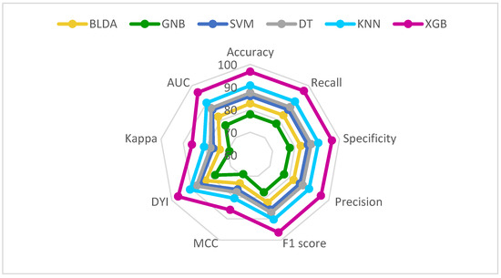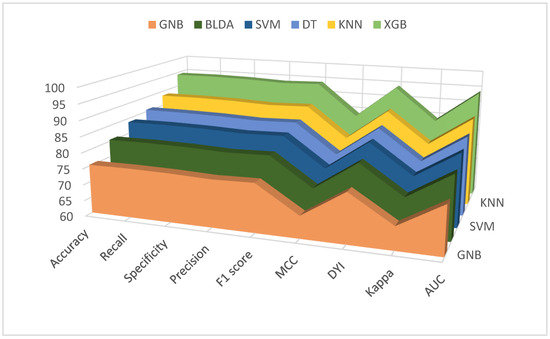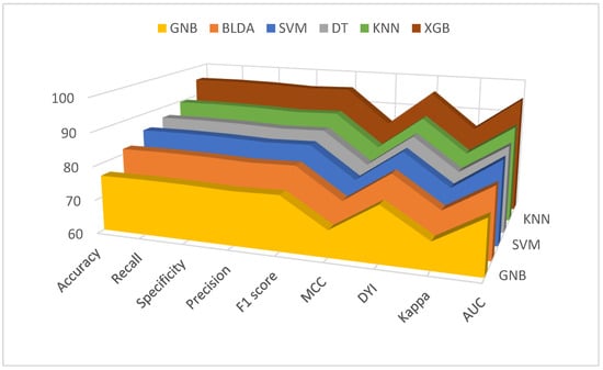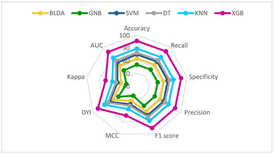 Table 1 presents the performance outcomes regarding the mortality associated with various classification methods, including DT, BLDA, GNB, KNN, SVM, and our novel XGB system. It is noteworthy that GNB and BLDA-based approaches demonstrate a relatively lower balanced accuracy, falling short of the 82% benchmark. Conversely, DT and SVM techniques exhibit superior classification prowess, nearing a balanced accuracy of 90%, surpassing the effectiveness of GNB and BLDA. In contrast, the KNN method achieves a result that is closest to the proposed XGB method, resulting in improved predictive capabilities. Particularly, the XGB system achieves an outstanding score surpassing 95%, showcasing remarkable performance in classification tasks.