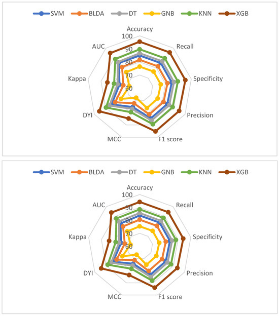 In this study, various methods were compared using the following metrics: specificity, precision (positive predictive value), recall (sensitivity), balanced accuracy, degenerate Youden index (DYI), F1 score, Matthew’s correlation coefficient (MCC), Cohen’s Kappa index (CKI), receiver operating characteristic (ROC), and area under the curve (AUC) [30]. The F1 score is defined as