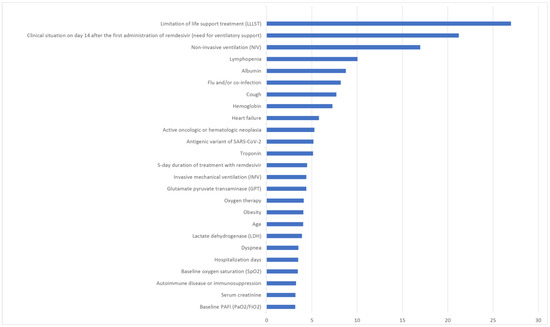 Background: Despite advancements in vaccination, early treatments, and understanding of SARS-CoV-2, its impact remains significant worldwide. Many patients require intensive care due to severe COVID-19. Remdesivir, a key treatment option among viral RNA polymerase inhibitors, lacks comprehensive studies on factors associated with its effectiveness. Methods: We conducted a retrospective study in 2022, analyzing data from 252 hospitalized COVID-19 patients treated with remdesivir. Six machine learning algorithms were compared to predict factors influencing remdesivir’s clinical benefits regarding mortality and hospital stay. Results: The extreme gradient boost (XGB) method showed the highest accuracy for both mortality (95.45%) and hospital stay (94.24%). Factors associated with worse outcomes in terms of mortality included limitations in life support, ventilatory support needs, lymphopenia, low albumin and hemoglobin levels, flu and/or coinfection, and cough. For hospital stay, factors included vaccine doses, lung density, pulmonary radiological status, comorbidities, oxygen therapy, troponin, lactate dehydrogenase levels, and asthenia. Conclusions: These findings underscore XGB’s effectiveness in accurately categorizing COVID-19 patients undergoing remdesivir treatment.