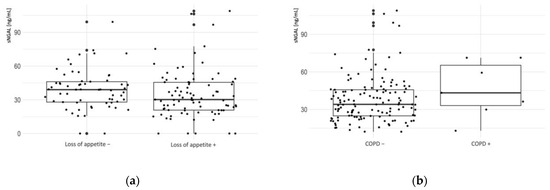 The distribution of sNGAL significantly deviated from normality based on the Shapiro–Wilk test results (W = 0.898, p < 0.001). We determined the median level of sNGAL as 35.0 ng/mL (IQR = 25.0–46.0) and did not find significant differences in the distribution of sNGAL between male and female patients. In order to assess whether any mentioned comorbidities or symptoms were associated with higher sNGAL levels in the studied population, we performed the Mann–Whitney U test between those who had a factor present and those who did not (Table 2). Among the reported comorbidities, we found that only patients suffering from asthma and COPD (chronic obstructive pulmonary disease) had significantly higher levels of sNGAL (Figure 1). Comparing sNGAL levels of participants who experienced specific symptoms with those who did not experience those symptoms, we found that convalescents with reduced appetite had statistically significantly lower levels of sNGAL.