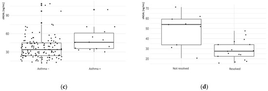 Boxplots presenting sNGAL levels among all patients by (a) asthma, with (+) meaning sNGAL levels in patients with asthma and (–) meaning sNGAL levels in patients without asthma; (b) COPD, with (+) meaning sNGAL levels in patients with COPD and (–) meaning sNGAL levels in patients without COPD; (c) reduced appetite, with (+) meaning sNGAL levels in patients who reported reduced appetite and (–) meaning sNGAL levels in patients who did not report reduced appetite; (d) a boxplot of sNGAL concentration in patients for whom dyspnea resolved or not between the 3rd and 9th month after the infection.