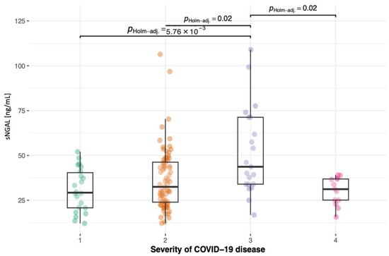 As mentioned above, all patients were assigned to one of the four groups in the modified COVID-19 disease severity scale by the WHO. Data across the four groups were compared using the Kruskal–Wallis test to assess the differences in sNGAL levels among the groups (Figure 2). We found that sNGAL levels were highest in the third group of COVID-19 severity. Interestingly, the hospitalized patients, who were most affected by the disease, did not present significantly higher sNGAL levels than the first and second groups.