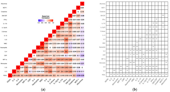 Matrices present the results of the Spearman correlation analysis of the factors mentioned above. Heatmap (a) presents correlation coefficients and matrix (b) depicts the associated p-values for each correlation coefficient (* for p ≤ 0.05, ** for p ≤ 0.01, *** p ≤ 0.001). Only factors correlating with NGAL above r = 0.2 are included. IL, interleukin; MCP-1, monocyte chemoattractant protein 1; GM-CSF, granulocyte–macrophage colony-stimulating factor; IFN-γ, interferon-gamma; WBC, white blood cells; CRP, C-reactive protein; MIP, macrophage inflammatory protein.