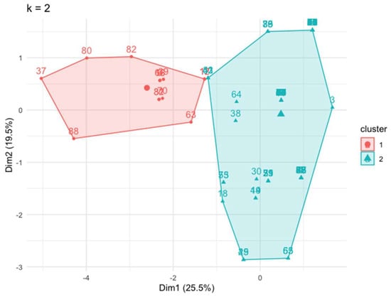 Two well-differentiated clusters generated by an unsupervised analysis using the “k means” technique. Dim: dimension.