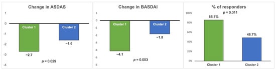Finally, the percentage of patients responding to anti-TNF (improvement ≥1.1 ASDAS or ≥2.0 BASDAI) after 6 months of follow-up was significantly higher for cluster 1, with 85.7% of respondents in cluster 1 vs. 48.7% in cluster 2 (p = 0.011) (Table 3 and Figure 2). There was also a significant improvement ≥2.0 in the BASDAI in cluster 1 (78.6% vs. 35.5% p = 0.003), but the improvement ≥1.1 in the ASDAS was not significant (35.7% vs. 27.6% p = 0.374).