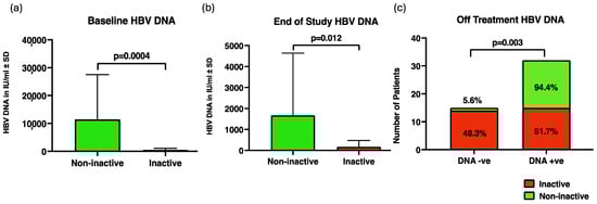 Thirty-one of the fifty enrolled patients were inactive carriers (defined as HBeAg negative, low HBV DNA of <2000 IU/mL, and persistently normal or near-normal ALT) [13]. At baseline, inactive carriers had a median HBV DNA of 213 IU/mL (interquartile range or IQR: 65–827 IU/mL), which was significantly lower than that of those who were not inactive carriers (median: 5860 IU/mL; IQR: 4520–9100 IU/mL) (p = 0.004) (Figure 1a). Treatment with TDF resulted in a rapid decline of HBV DNA in both groups; from 12 months onwards, 46/48 patients had persistently negative HBV DNA (Table 1). At the end of the 3-year treatment period, all inactive carriers (n = 29) continued to have undetectable HBV DNA, while only two of those who were not inactive carriers (n = 18) showed undetectable HBV DNA. Six months after withdrawal of TDF treatment, the median HBV DNA in inactive carriers continued to be significantly lower than those who were not inactive carriers (9 IU/mL; IQR: 0–199 IU/m vs. 126 IU/mL; IQR: 68–2070 IU/mL) (p = 0.012) (Figure 1b). In addition, there were significantly more inactive carriers who remained HBV DNA negative (14/29 or 48.3%) compared to those who were not inactive carriers (1/18 or 5.6%) (p = 0.003) (Figure 1c).