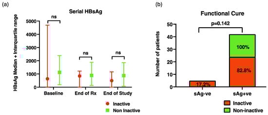 (a) Serial HBsAg levels at various time points during the study period between those who were and who were not true inactive carriers; (b) the proportion of patients who achieved functional cure 6 months after completion of treatment between those who were and who were not true inactive carriers. ns: not significant; Rx: treatment.
