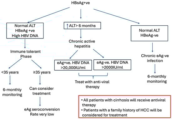 Treatment guidelines from Western countries suggest monitoring with ALT and HBV DNA every 6 to 12 months but not treatment for inactive carriers along with non-invasive testing for fibrosis every 1 to 2 years [6,7,12]. For those patients who are HBeAg negative but whose baseline HBV DNA is ≥2000 IU/mL, treatment is recommended if there is more than mild inflammation on liver biopsy or significant fibrosis on non-invasive testing [6,7,12,20]. The local treatment algorithm for patients with chronic hepatitis B is shown in Figure 3. However, recent treatment guidelines from China have recommended treating all HBsAg-positive patients who have a history of cirrhosis, liver failure liver transplantation, HCC or those who are about to be immune suppressed [21]. Those who are HBsAg positive with detectable DNA and ALT less than the upper limit of normal are treatment-eligible irrespective of HBeAg status or HBV DNA level if they have a family history of HCC or cirrhosis, are over 30 years, have advanced hepatic fibrosis or cirrhosis or have extrahepatic manifestations of chronic hepatitis B. This simplification in treatment guidelines is intended to expand treatment indications and increase the number of patients who receive antiviral therapy including those with HBeAg-negative chronic infection. The rationale for the expansion of treatment guidelines is to include patients with HBeAg-negative chronic infection or gray-zone patients who have intermittent flares in ALT and HBV DNA which may go undetected for lack of regular monitoring. This subset of patients may comprise a significant proportion of HBeAg-negative patients as indicated in one report, which showed that up to 50% of all HBeAg-negative patients were classified as gray-zone patients [22] who may have been overlooked by current treatment guidelines due to the inability to clearly classify such patients. Several studies have reported improved clinical outcomes in gray-zone patients who received long-term nucleoside analog therapy. In a study of over 450 patients in Taiwan, a subset of gray-zone patients was found to be at high risk for the development of HCC, leading the authors to conclude that they would have benefited from antiviral treatment [23]. Unfortunately, hepatitis B surface antigen loss or seroconversion was not reported.
