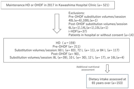 We selected individuals from the 521 patients undergoing maintenance dialysis with HD or OHDF at Kawashima Hospital as of 1 April 2018. Patients with substitution volumes of 40 L (n = 6) and 100 L (n = 1) in pre-OHDF and 6 L (n = 1), 14 L (n = 1) and 15 L (n = 1) in post-OHDF, intermittent infusion hemodiafiltration patients (i-HDF, n = 37), and patients in the hospital or who did not provide consent (n = 14) were excluded.