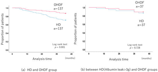 In addition, patients receiving HD who had albumin leakage of more than 3 g (albumin leakage: 3.92 g/session ± 0.46) had a similar mortality rate to patients receiving OHDF and similar albumin leakage (albumin leakage: 4.01 g/session ± 1.55) (p = 0.713, log-rank test) (Figure 2b).