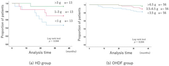 The albumin leakage rates were classified into three levels, as in the OHDF group: less than 3.5 g, 3.5–6.5 g, and more than 6.5 g.