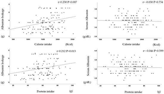 There was a significant positive correlation between dietary intake (calories, protein, phosphorus, and potassium) and albumin leakage but not serum albumin (Figure 5).