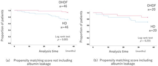 When comparing the OHDF and HD groups without including albumin leakage in propensity score matching, the 3-year prognosis was significantly better in the OHDF group. (p = 0.005) after adjusting for background factors by propensity score matching (46 pairs of HD and OHDF) (Figure 6a) (Supplementary Table S8).